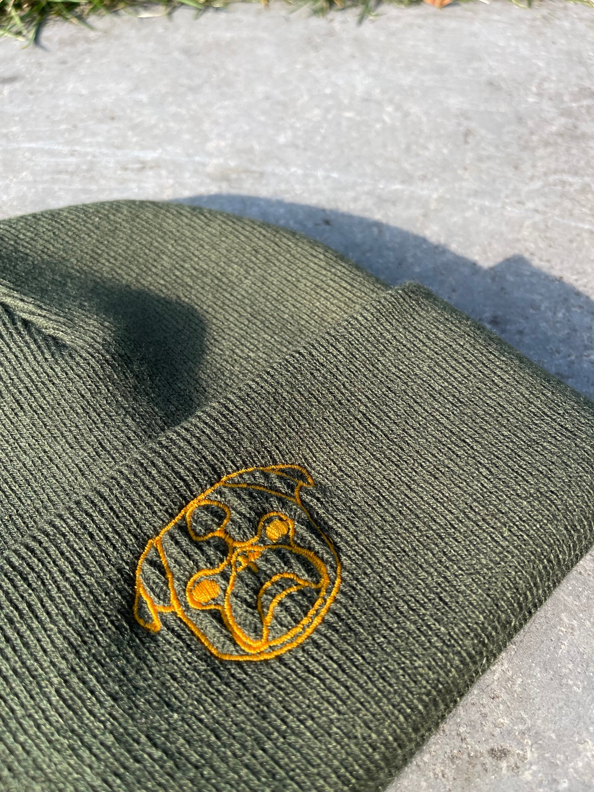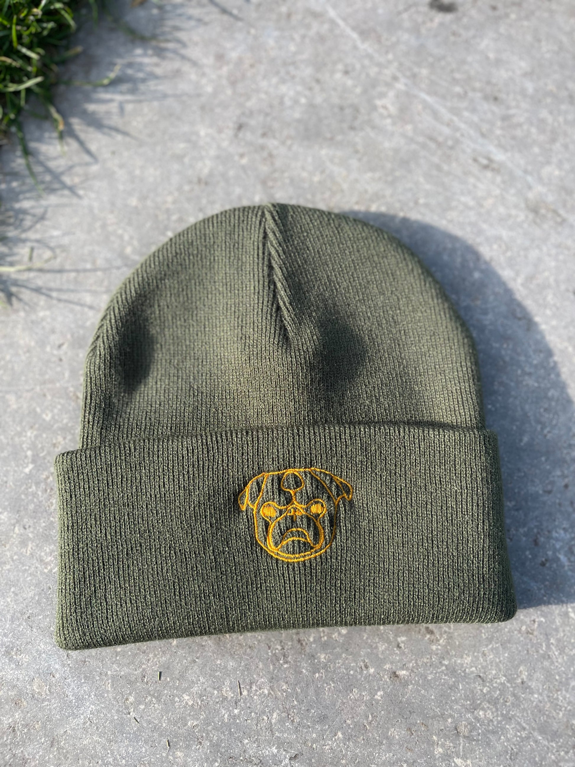 Olijfgroenen muts met een lichtoranje geborduurde Mops als logo